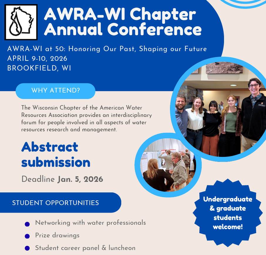 April 9-10. Brookfield, WI. This year's theme is celebrating a milestone- AWRA-WI at 50: Honoring Our Past, Shaping our Future. The annual meeting is designed to create a student-friendly atmosphere, with undergraduate and graduate students strongly encouraged to present (poster or oral) and discuss Wisconsin-related research in all aspects of water science and policy. Each student presenter is provided with constructive comments, and $200 awards will be offered to four different student presenters. Other planned activities include a new member coffee hour with prize drawings and a student career panel luncheon. Abstracts due Jan. 5. Registration will be available in Feb. 2026.