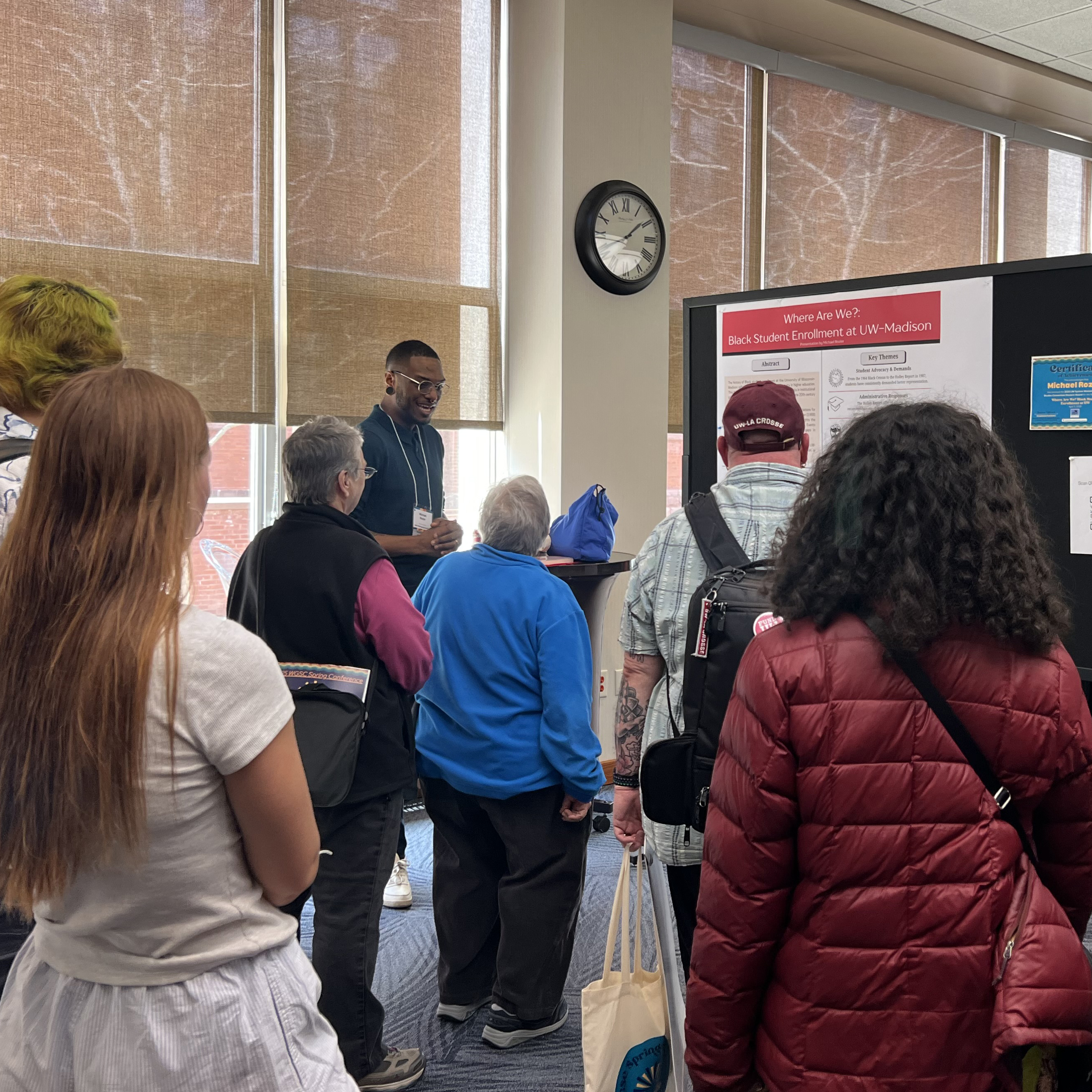 Our intern, Michael Rozier, conducted archival research on the history of the enrollment and retention of Black students at UW–Madison. He presented his poster “Where Are We? Black Enrollment at UW” at the Women’s & Gender Studies Consortium spring 2025 conference and engaged dozens of attendees on questions about identity and enrollment at UW, his research limitations, and systemic barriers for Black students at UW. Michael also won a student award for his work. Take a look at Michael's poster here.