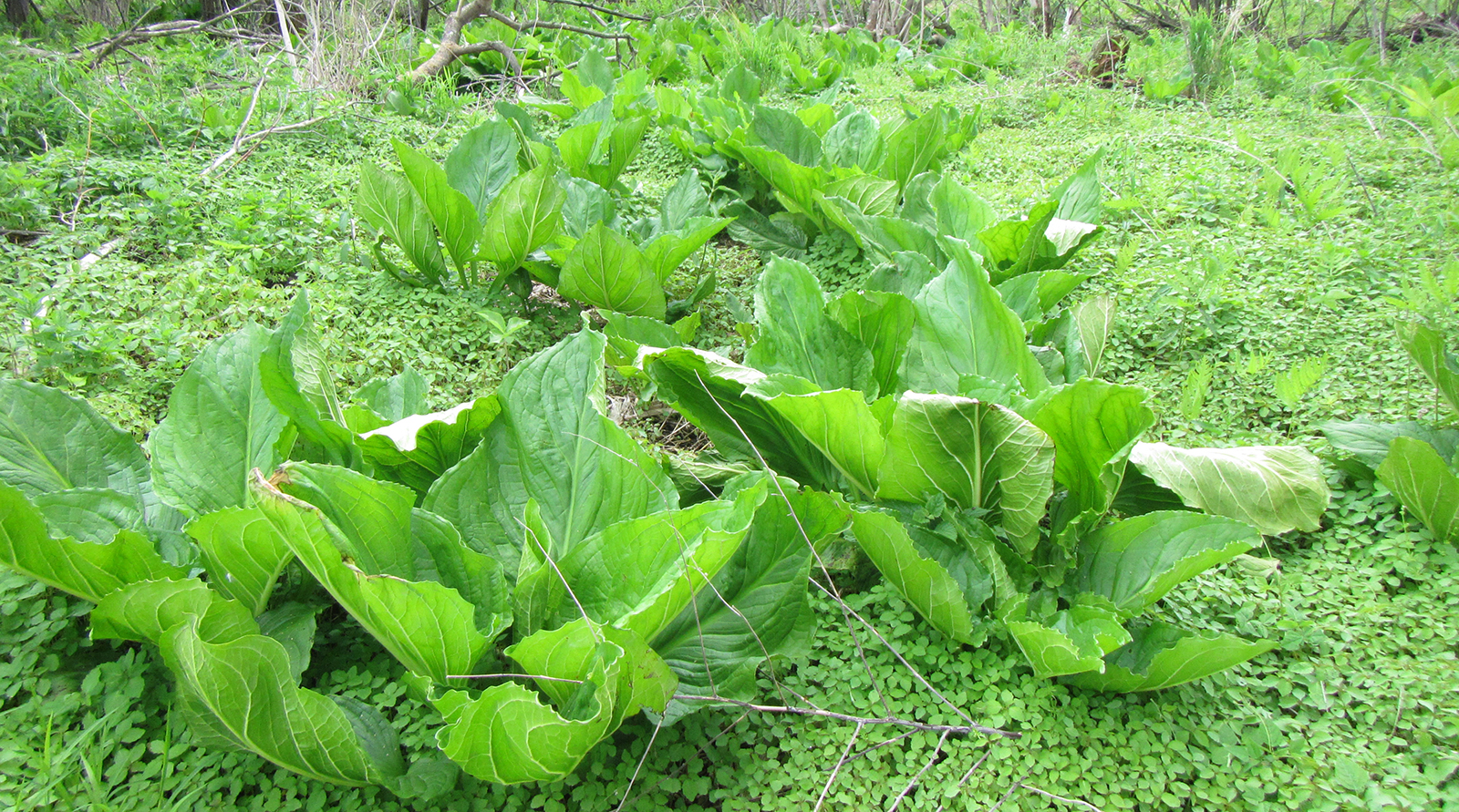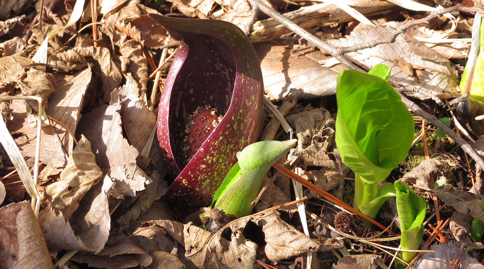 The giant leaves of skunk cabbage emerge next, rolled up tightly but quickly unfurling and growing to over a foot in diameter. These giant leaves on the landscape indicate areas where groundwater is near to the surface. Many wetland explorers have also noted that the soil around skunk cabbage tends to be very soft and may swallow a boot after a poorly placed step!