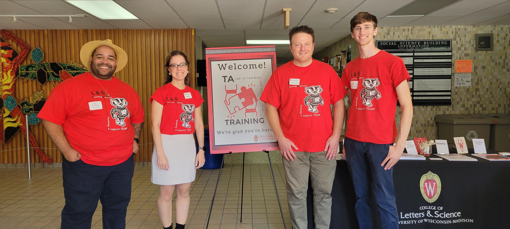 (pictured from left to right is Morgan Henson, Project Assistant, Gullickson Fellow; Lynne Prost, Assistant Dean for Graduate Student Academic Affairs; B Dowling, Teaching Assistant; Cameron Jones, Teaching Assistant.)