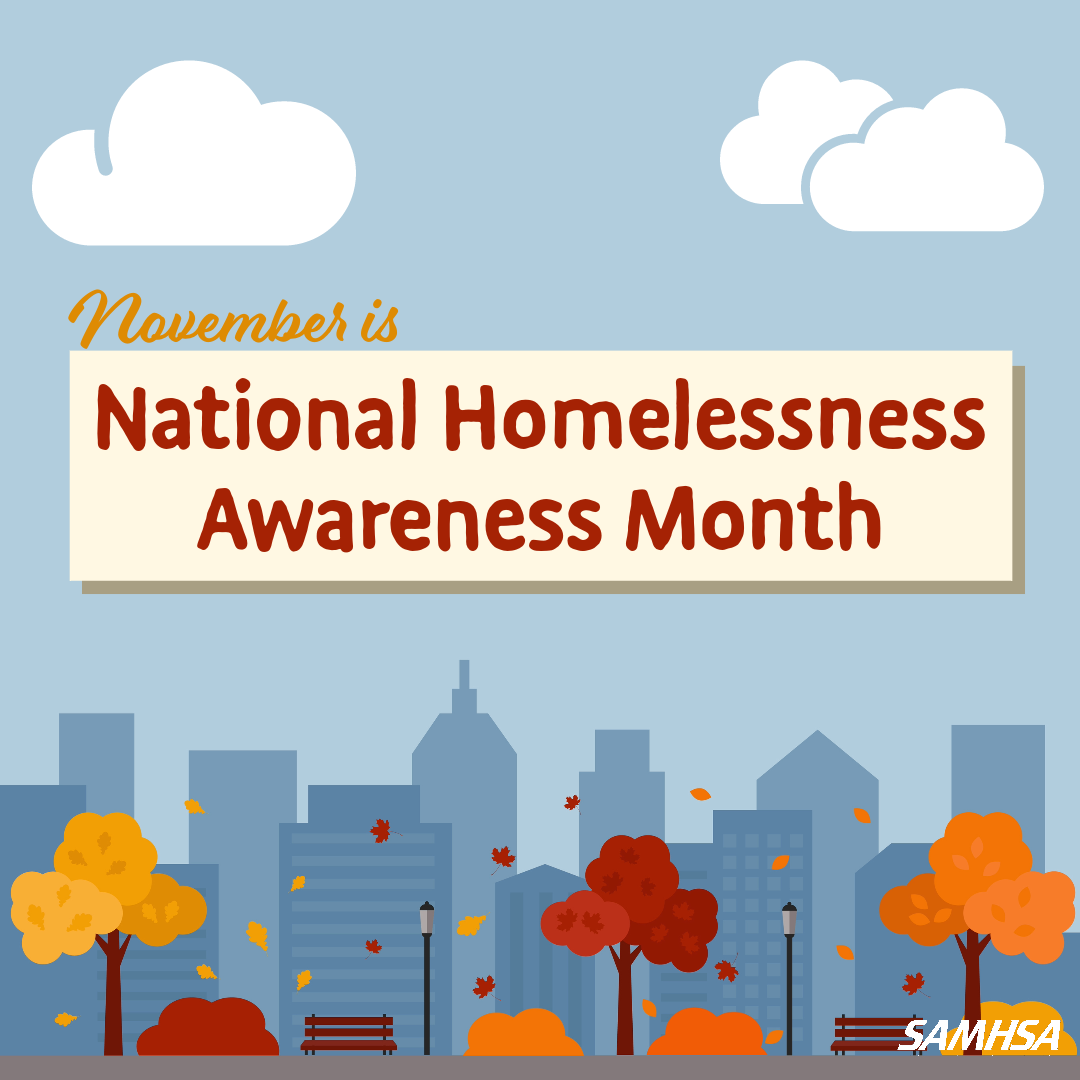 November is National Homelessness Awareness Month. SAMHSA works in partnership with federal, state and local partners and national experts to provide training on housing, treatment and recovery models focused on adults, children, and families who are experiencing or at risk of homelessness and have serious mental illness and/or serious emotional disturbance, and substance use. These partnerships contribute to housing stability, recovery, and ending homelessness.